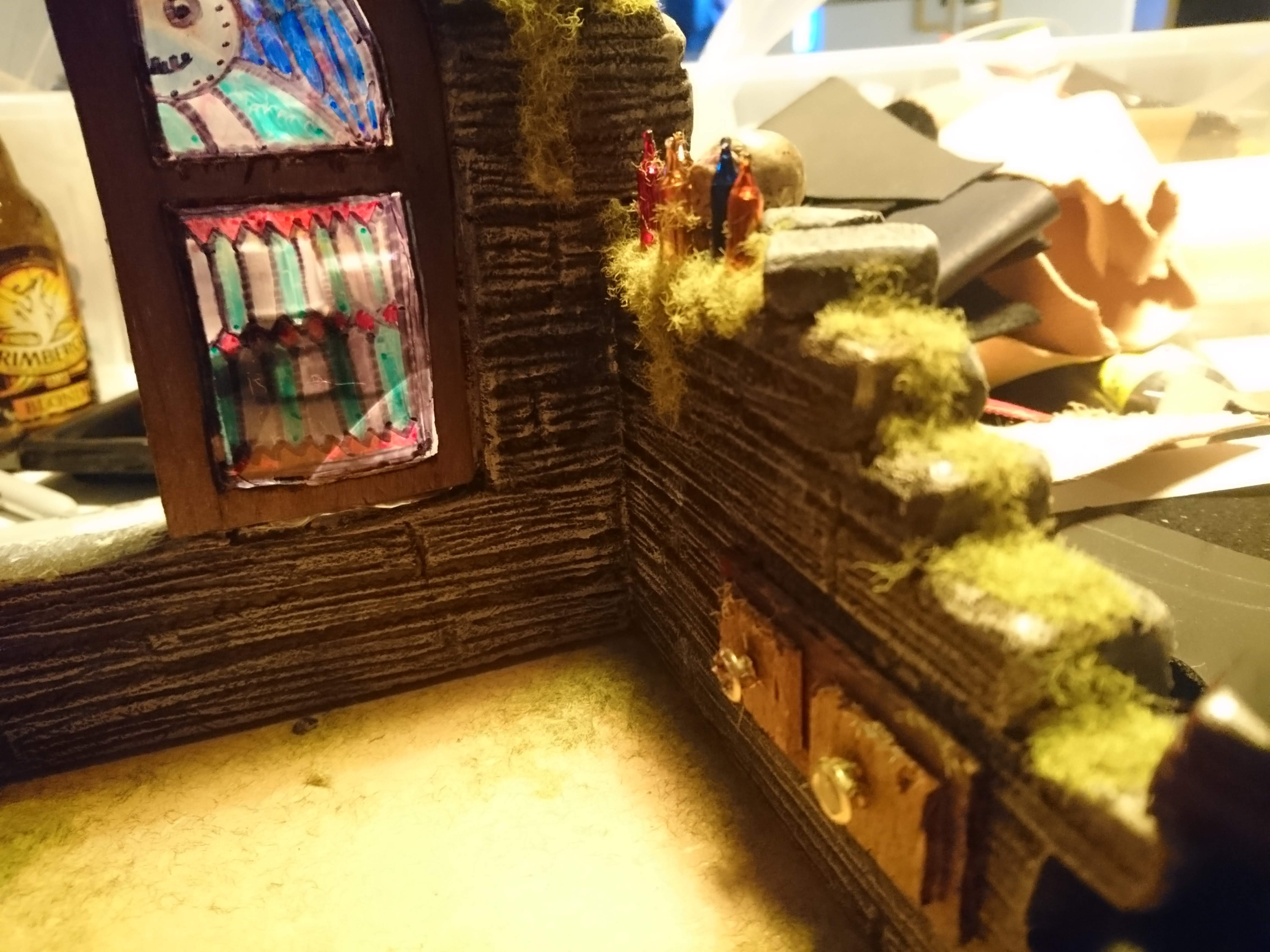 La base est un carré en MDF, sur lequel j’ai ajouté une structure en polystyrène sculpté. Les détails sont en chutes de matériaux divers, glanés dans les caisses de mon atelier. La piste est, comme d’habitude, recouverte de feutrine rouge.